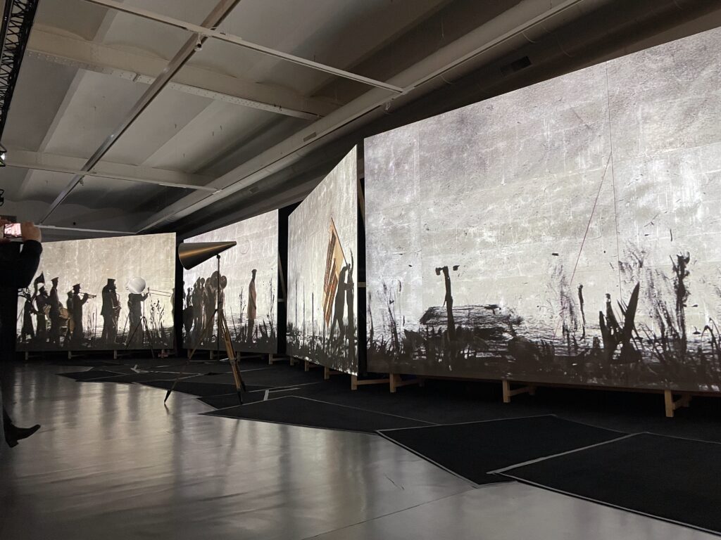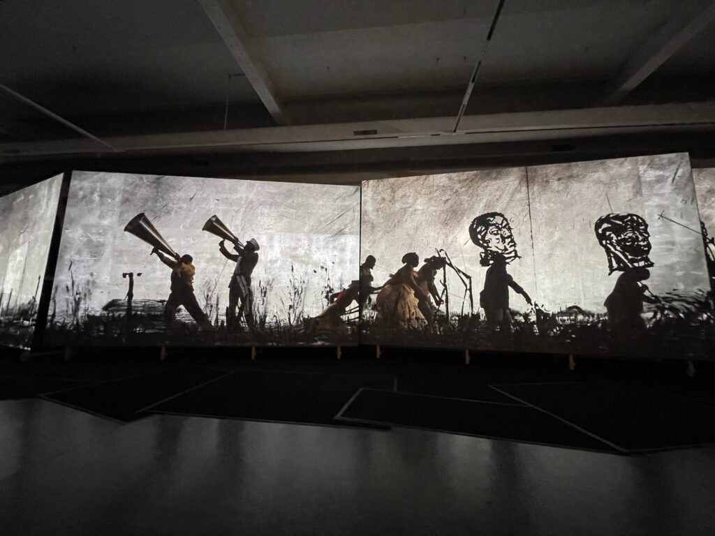 Die Installation zeigt eine endlose Prozession von Figuren in Silhouette, die sich durch eine imaginäre Landschaft bewegen. Kentridge schuf dieses Werk 2015 in Zusammenarbeit mit etwa 40 Künstlern, Musikern, Schauspielern und Technikern in seinem Johannesburger Studio.