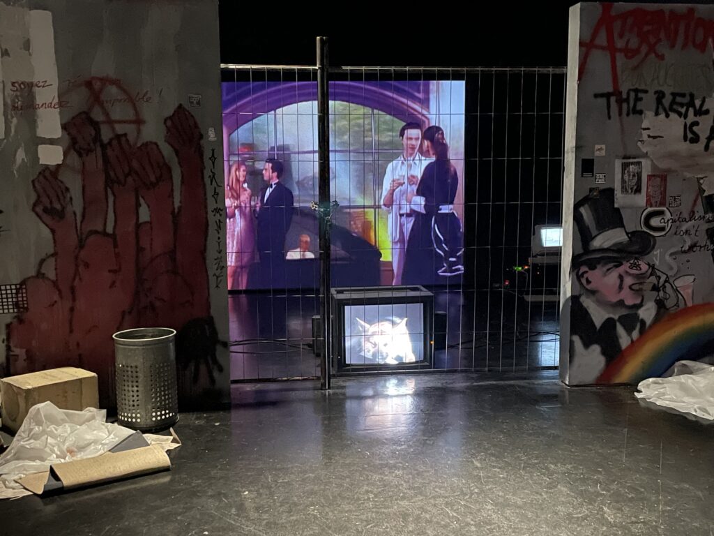 Die Installation inszeniert einen komplexen Raum der Sichtbarkeit: Auf einer Videoprojektion wird eine urbane Cocktailparty der sogenannten „Yuppies“ gezeigt, während im Hintergrund Szenen von Unruhen und urbaner Gewalt sichtbar bleiben. Die projizierten Bilder werden durch einen physischen Zaun mit Stacheldraht vom Publikumsraum getrennt, vor dem ein Monitor mit der Darstellung eines Wachhundes positioniert ist.