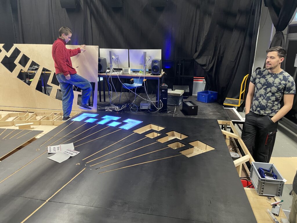 Die Trittfelder werden mit unterschiedlichen Prototypings auf Usability getestet. Jeder soll sie bedienen können, ohne das Gleichgewicht zu verlieren. Die Tasten werden für starken und leichten Druck, auf viel und wenig Gewicht getestet. Ausgemessen, zugeschnitten, zusammengesetzt, verkabelt und programmiert. Jede Menge Arduinos, es wird gelötet und mit einer Unmenge an LED Lauflichtmetern wird die Bedienung verständlich. Das Feedback bilden Ton, Licht und Animation des Publikums ab.