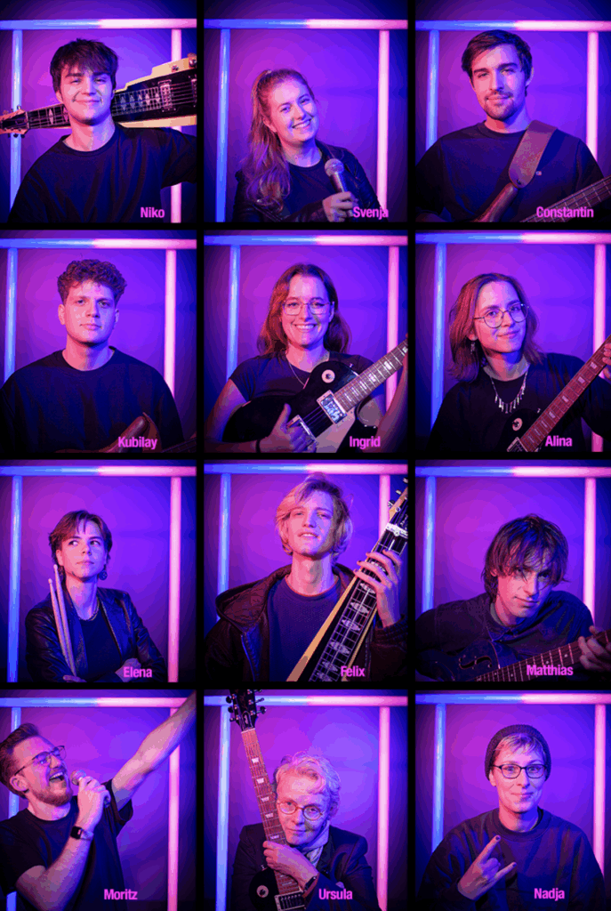 Auftritt, ein interaktiver Experience Space für 4 Spieler*innen, macht uns zu berühmten Bandmitgliedern. Mit Leuchtarmbändern wird gleich schon eine Einteilung gemacht.